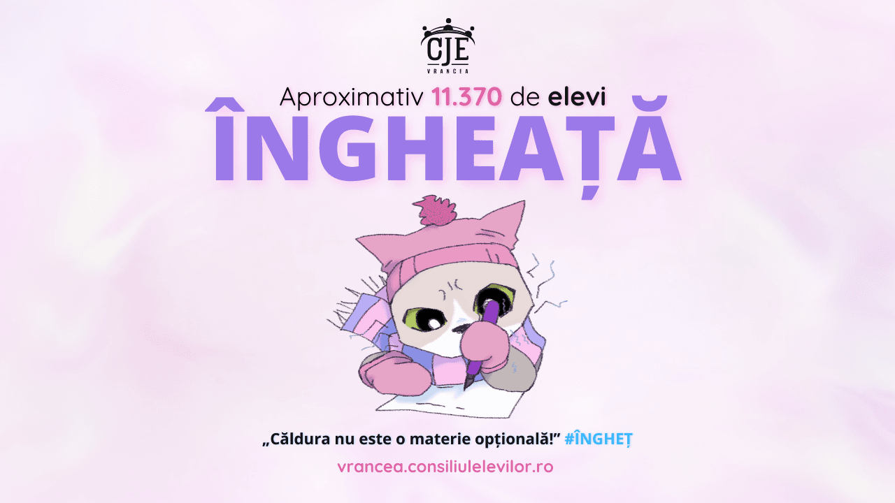 Astfel, Consiliul Județean al Elevilor inițiază mișcarea „Căldura nu este o materie opțională!”, pentru a sensibiliza opinia publică și autoritățile. Vineri, 15 noiembrie, elevii sunt invitați să vină cu pături, mănuși, fulare în unitățiile de învățământ afectate. Îi încurajăm să se posteze cu acestea pe rețelele de socializare, folosind hashtag-ul #Îngheț, și să creeze pancarte care să transmită mesajul nostru.